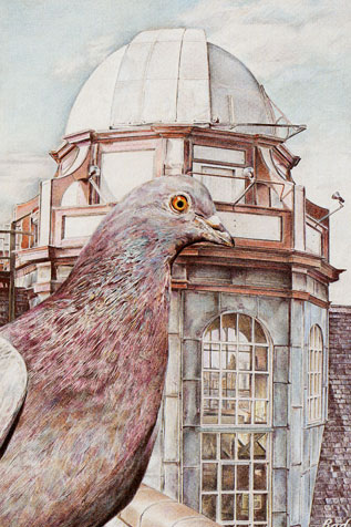 One of a series (of four) pictures showing birds found in towns and cities. The Godlee Observatory, on the roof of the University of Manchester's Sackville Street Building, features in the background.